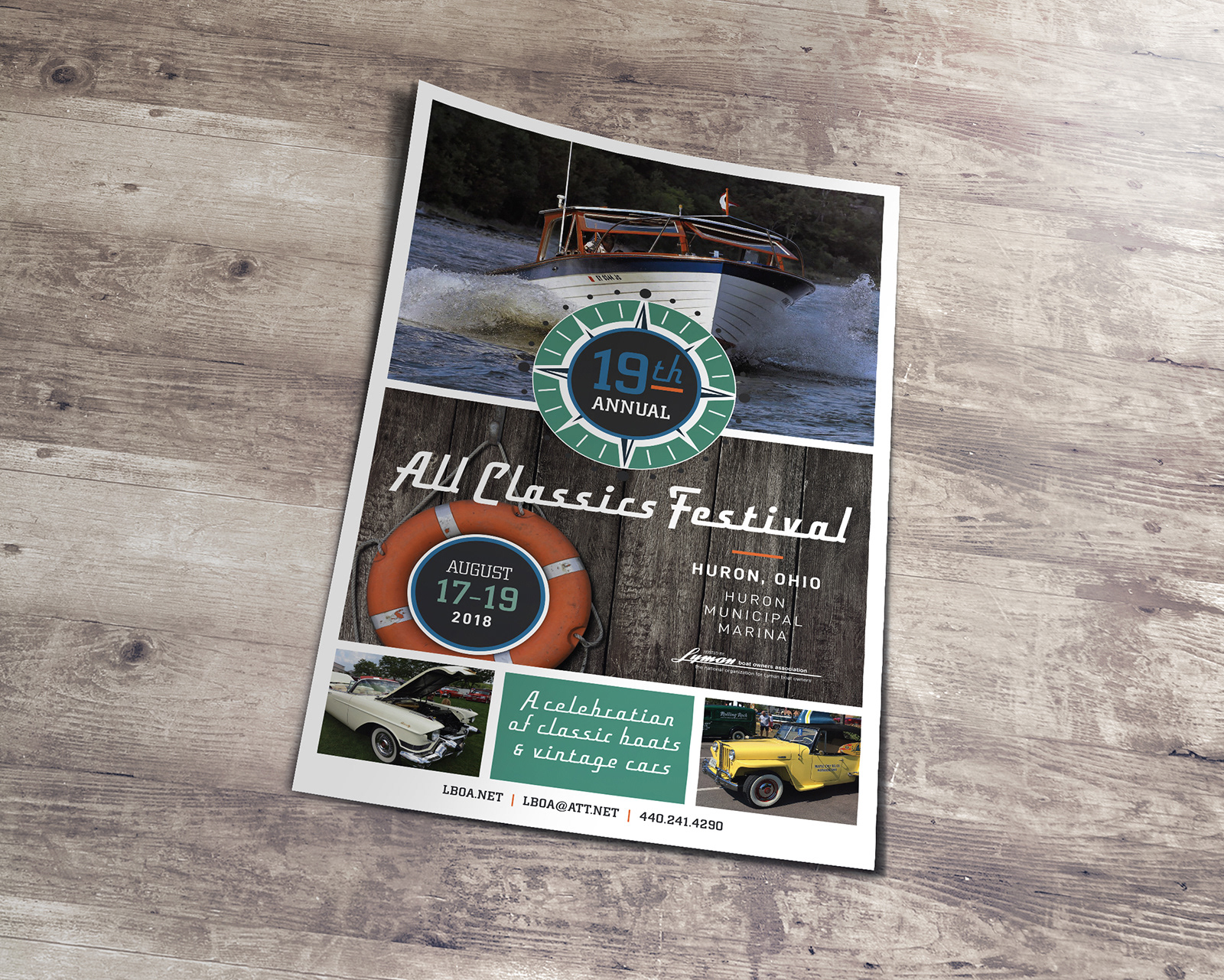 | Annual Event Logos, Posters & Attire | Classic boats and vintage cars at an annual summer Lake Erie event in Huron just called for a retro approach to the typography and compass treatment on this logo and poster. From thumbnail sketches to finished logo art, posters, t-shirts and give aways, Lesko Design merged contemporary nautical style with modern flair to appeal to an audience of all ages. Their love of the classic wood boats and restored antique cars was shared by all attendees of this annual event. In 2019, they celebrated their 20th Annual Festival. Lesko Design carried through the look from this favored approach with an updated logo, color palette and poster design.